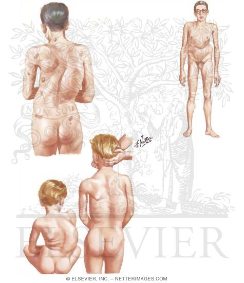 Dans certains cas, la paroi thoracique peut être « incurvée » ou poussée en avant donc présenter une syphoscoliose. Certains sujets présentent aussi simplement une scoliose, et d'autres cas encore, aucune scoliose...
